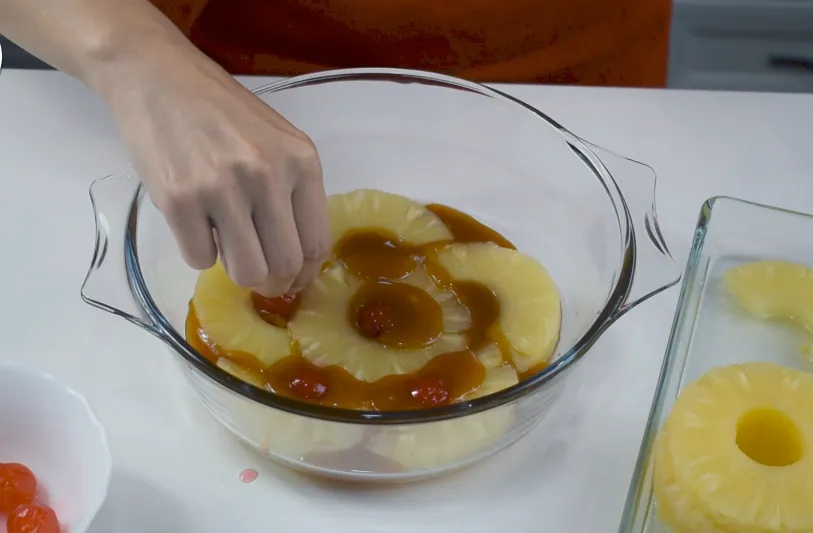 -En cada hueco de piña, colocamos una cereza en almíbar. Dejamos el molde a un lado mientras preparamos la masa del bizcocho.