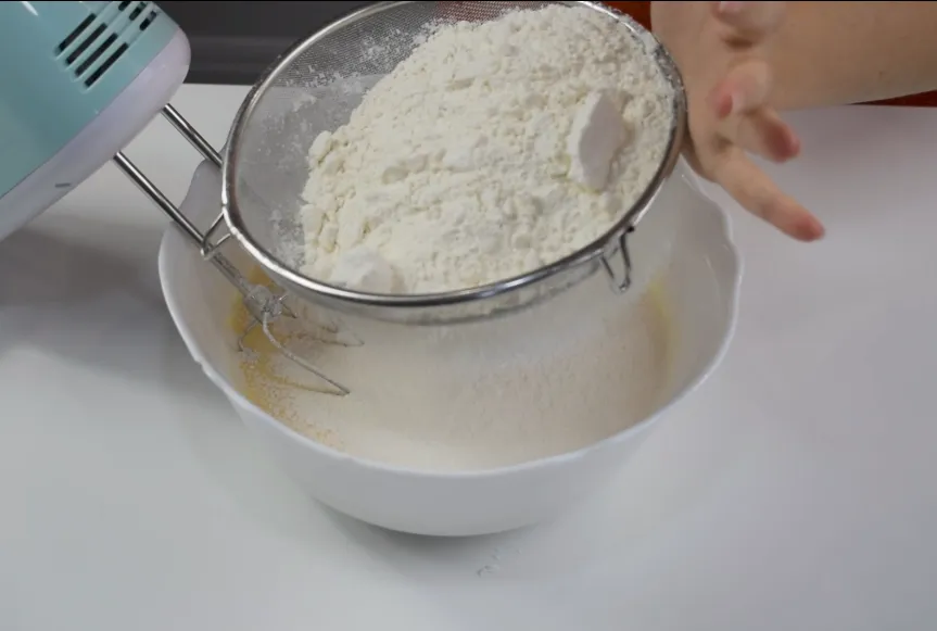 -Agregamos la harina y la levadura tamizadas y mezclamos con las varillas eléctricas hasta obtener una masa homogénea. Para que la harina no salga volando, mezclaremos primero un poco con las varillas apagadas e iremos subiendo la velocidad progresivamente.