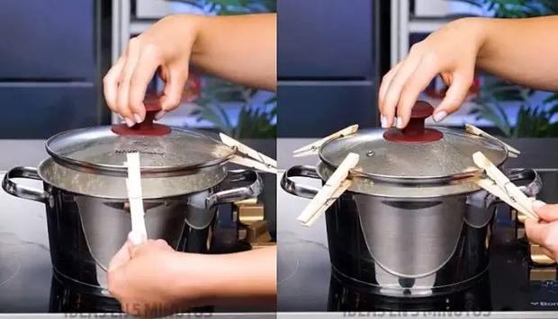Pero no hace falta comprar nada teniendo unas pinzas de la ropa en casa, en la foto superior puedes ver cómo colocar la tapa de la olla sin encajar para que no desborde el agua y dejar escapar el vapor haciendo uso de cuatro pinzas. Y la verdad es que según lo que se esté cocinando y lo que se quiera conseguir, no hace falta utilizar tantas pinzas, con una puede ser suficiente.