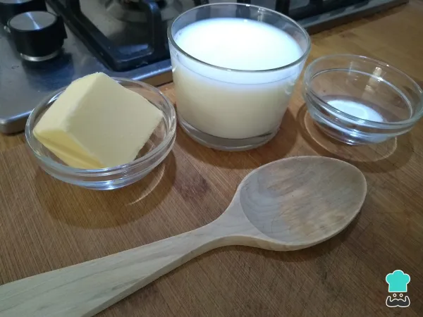 -Combina la leche y la mantequilla: Una vez que la mantequilla esté completamente derretida, vierte lentamente la leche caliente sobre la mantequilla derretida, batiendo constantemente con un batidor de mano o una cuchara de madera. Esto ayudará a emulsionar la mezcla y crear una crema de leche suave y homogénea.