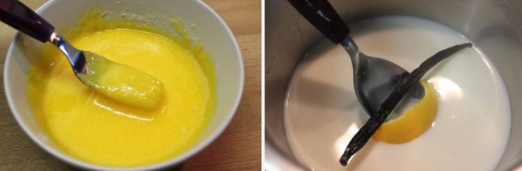 -Al calentar la leche, intentaremos que no llegue a hervir. El calor que alcancemos es suficiente para infusionar correctamente la vainilla y la cáscara de limón. Lo haremos fuera del fuego y sin prisas.