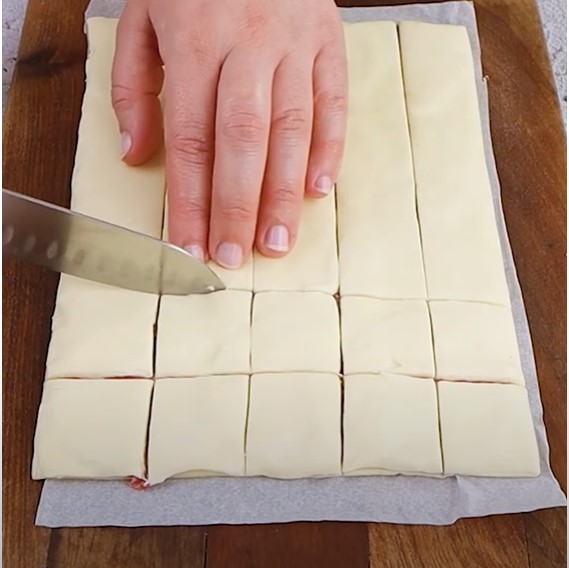 Dobla la masa de hojaldre sobre sí misma, presionando suavemente para sellar. Corta en cuadrados y colócalos en la heladera durante 10 minutos.