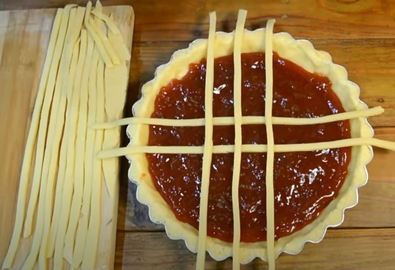 -Rellena la base de la tarta con el dulce de membrillo o batata derretido y enfriado, esparciéndolo de manera uniforme. Estira la otra parte de la masa y córtala en tiras de aproximadamente 1 cm de ancho, colocándolas sobre el relleno en forma de rejilla (entrecruzadas).