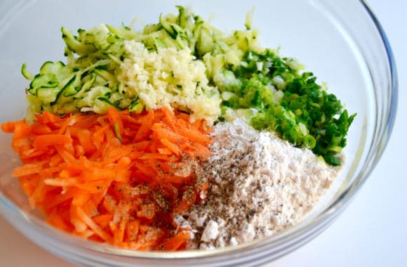 -En un tazón grande, combina la col rallada, las cebollas picadas, el ajo picado, los huevos, la harina, la sal, la pimienta roja molida y la pimienta negra. Mezcla bien hasta que todos los ingredientes estén distribuidos uniformemente.