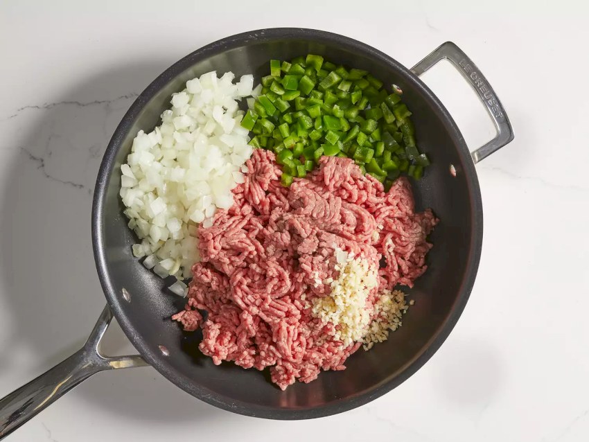 -Cocinar la carne: Ahora es el momento de agregar la carne picada a la sartén y cocinar hasta que esté dorada y completamente cocida, aproximadamente 5 minutos.