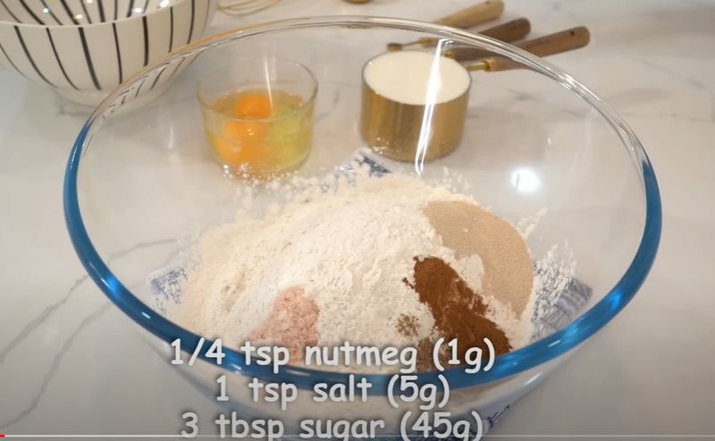 -Activar la levadura: En un bol pequeño, disuelve la levadura y una cucharadita de azúcar en la leche tibia. Deja reposar unos 5-10 minutos, hasta que la mezcla esté espumosa.