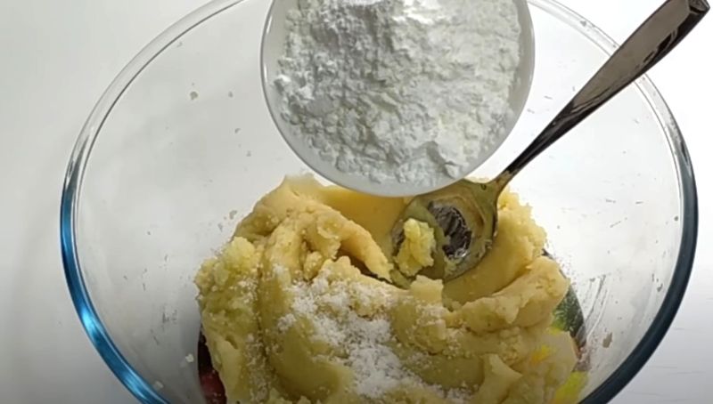 Incorpora la sal restante (1 cucharadita) y la fécula de maíz al puré de patatas. Mezcla bien hasta que todos los ingredientes estén completamente integrados, formando una masa homogénea y maleable.