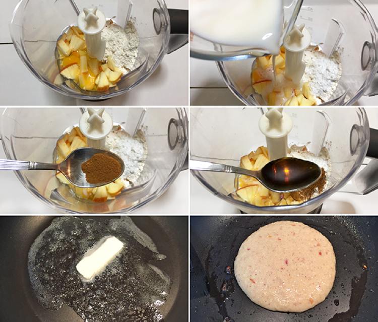 -Mientras tanto en el vaso de la batidora o robot de cocina ponemos la harina, la levadura, canela y miel, el azúcar y el resto de mantequilla (70 g). Añadimos las manzanas salteadas y la leche.