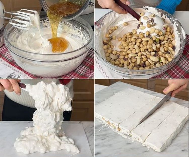 -Incorporar la miel: Una vez que la miel alcance los 124 °C, viértela lentamente sobre las claras montadas sin dejar de batir.