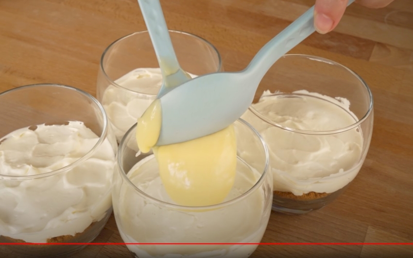 -Colocamos una capa de crema sobre la base de galletas en cada recipiente, seguida por una capa de crema de limón, otra capa de chantilly y, finalmente, otra capa de crema de limón.