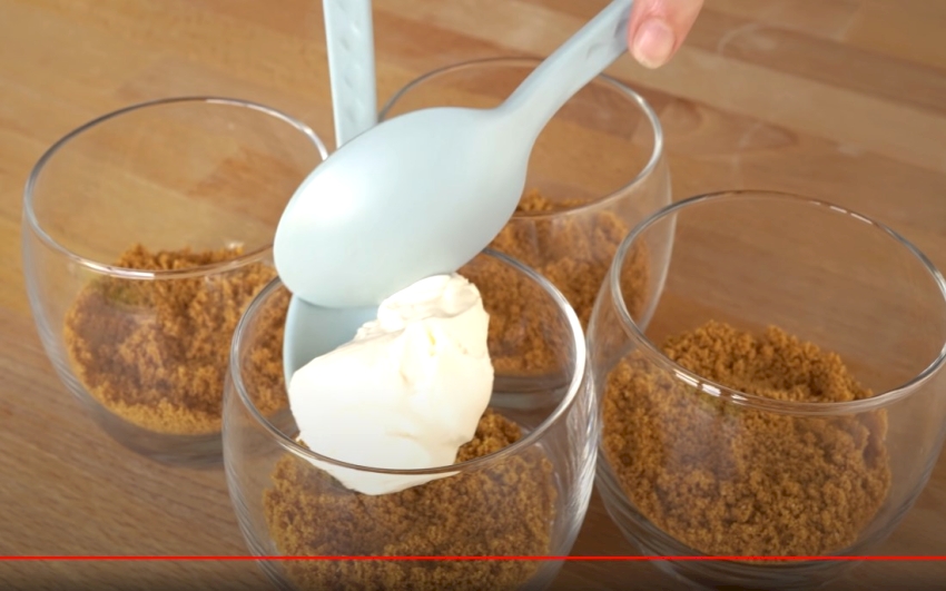 -En un procesador de alimentos trituramos 200 gramos de galletas hasta obtener migajas finas. Utilizamos estas migajas como base en recipientes individuales. En otro bol, batimos bien 400 gramos de queso crema con 180 gramos de azúcar.