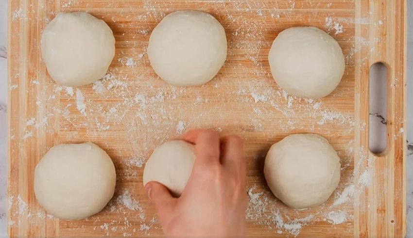 Pasado el tiempo de reposo, divide la masa en porciones del tamaño de una pelota de ping-pong y forma bolitas con tus manos. En una superficie enharinada, estira cada bolita de masa con un palo de amasar hasta obtener un disco fino, de aproximadamente medio centímetro de espesor.