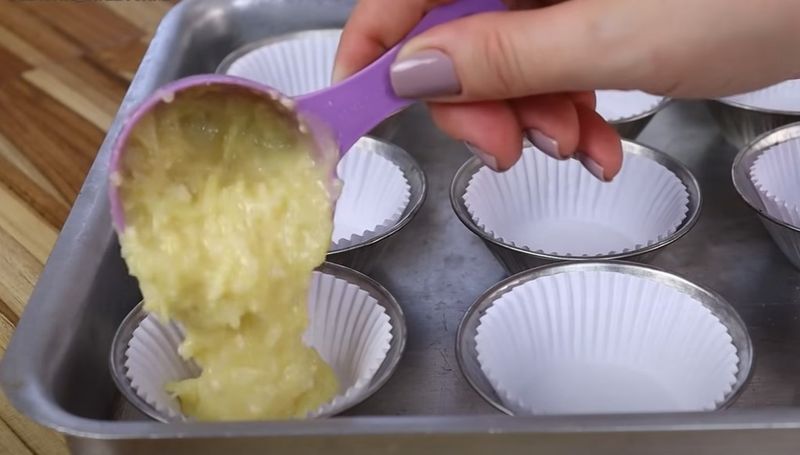 -Rellena los moldes, dejando un dedo de espacio en la parte superior para que los muffins puedan subir sin desbordarse.