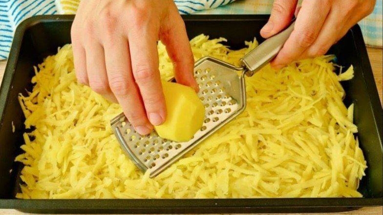 -Prepara las papas: Ralla las papas con un rallador grueso y colócalas en un paño limpio. Exprime bien para eliminar el exceso de líquido y evitar que el pastel quede aguado.