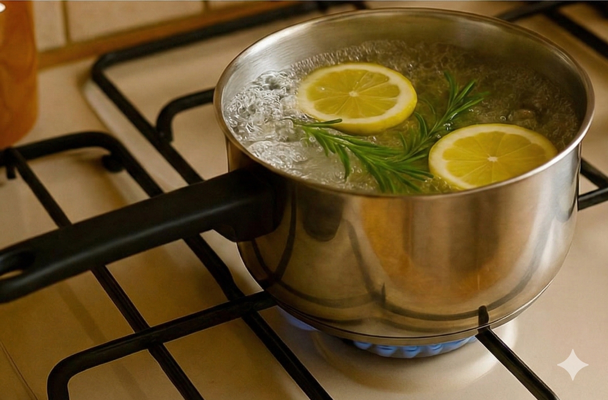 Hervir: Lleva el agua a ebullición y déjala cocinar unos 10-15 minutos. Durante la ebullición, el aroma del limón y el romero se extiende por el aire, purificando el ambiente.