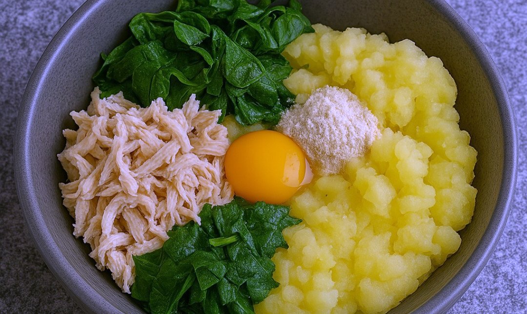 🟦 Mezcla en un bol el puré de papa, media taza de espinaca cocida, el huevo, la fécula, la harina de avena, el ajo, sal y pimienta. Remueve bien hasta lograr una masa homogénea, suave pero consistente.