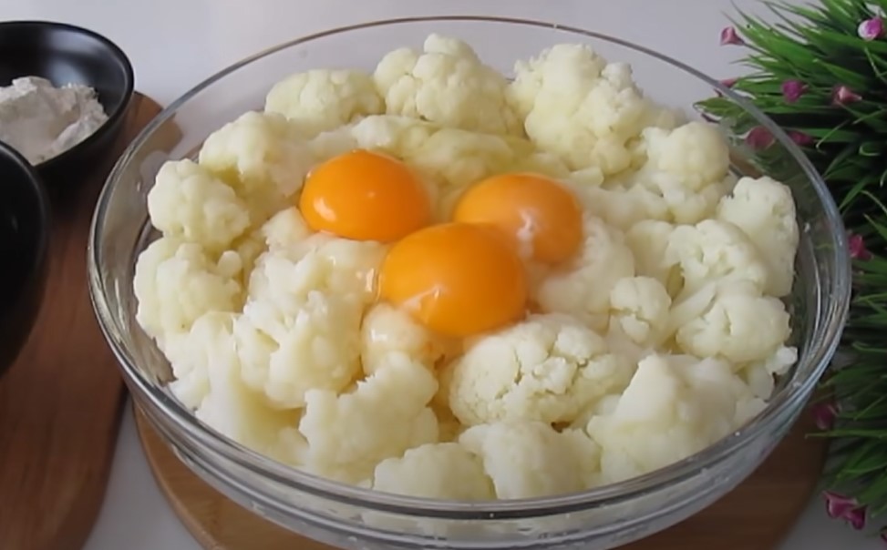 Añade sobre los ramilletes de coliflor cocida, los 3 huevos crudos y con la ayuda de un triturador o batidor de mano, comienza a triturar. Verás como se va formando una especie de pasta, muy similar a un puré de patatas.