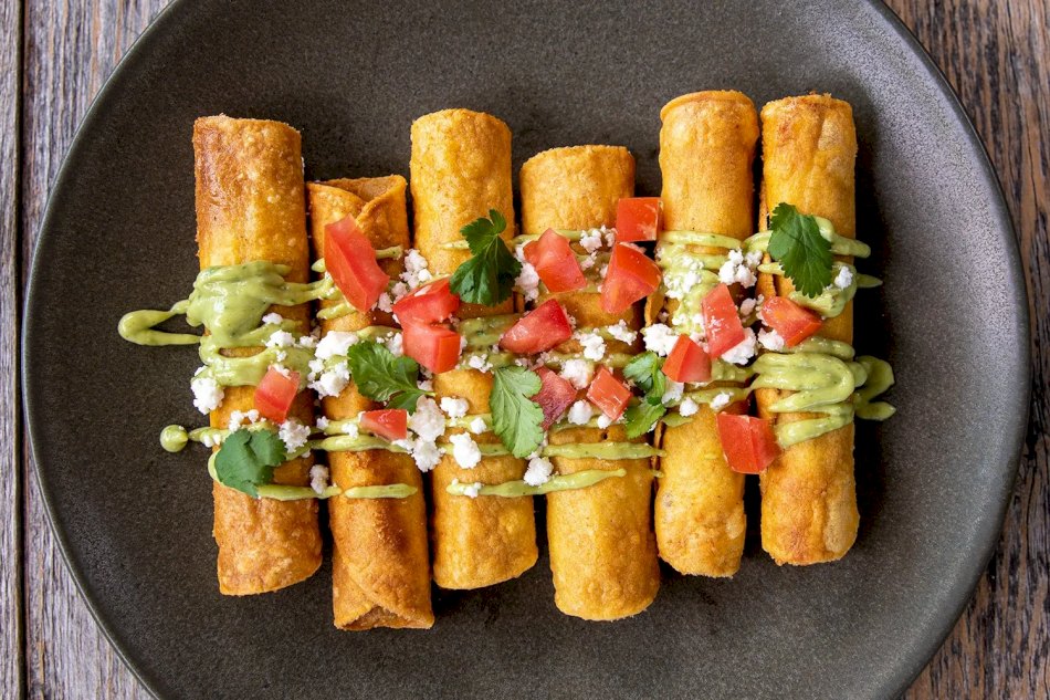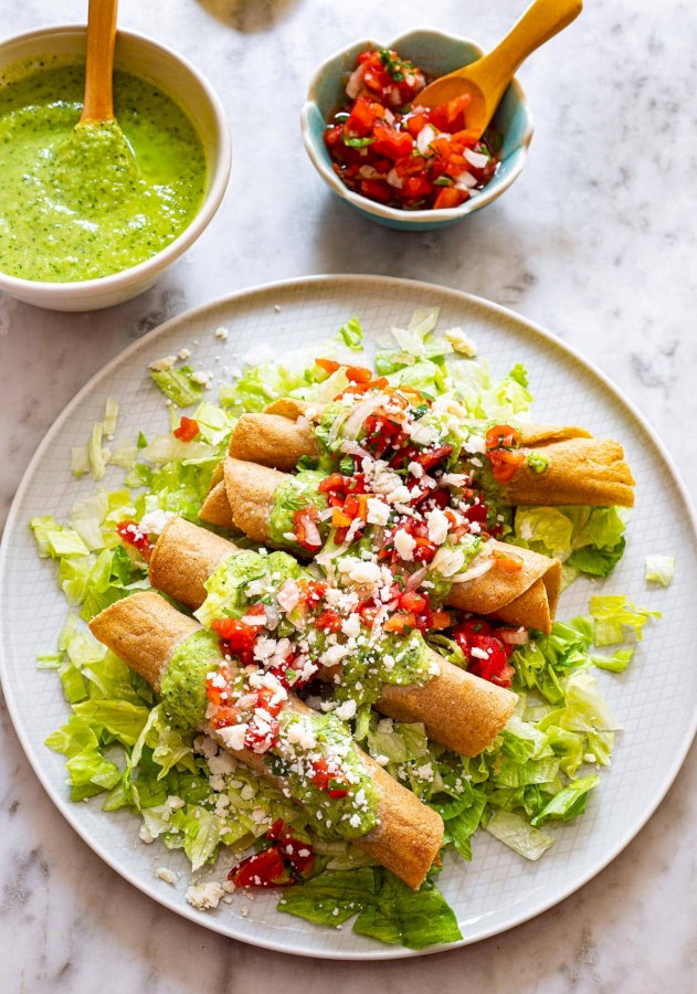 Servir las flautas con unas 2 cucharadas de crema agria, 3 cucharadas queso fresco, 3 cucharadas de pico de gallo y 2 cucharadas de guacamole.