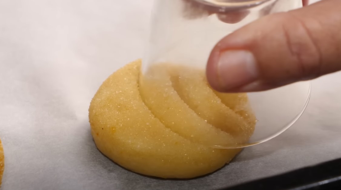 - Forma las galletas: Toma una cucharada de la masa y, con las manos, forma una bola. Luego, aplasta suavemente con la palma de la mano para darle forma de galleta. Usa el borde de un vaso de cristal para hacer surcos decorativos sobre la superficie de la galleta. 🍪