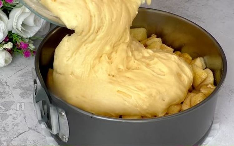 - Vierte el resto de la masa sobre las rodajas de manzana, extendiéndola uniformemente para cubrirlas.