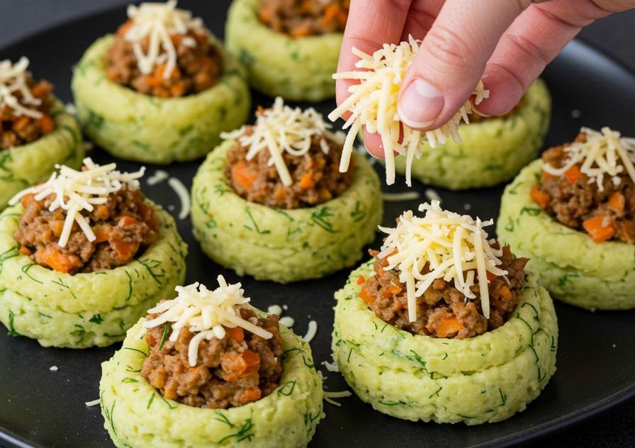 ✅ Rellena cada nido con una o dos cucharadas del picadillo y cúbrelos con queso rallado. Hornea en horno precalentado a 200 °C (390 °F) durante 15 a 20 minutos, hasta que los bordes se vean dorados y el queso esté fundido. Retira la bandeja y deja reposar de 3 a 4 minutos antes de servir. Espolvorea perejil fresco y disfruta de estos nidos calientes.