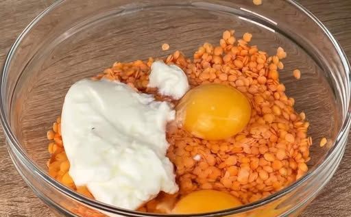 En un bol grande, mezcla las lentejas remojadas, los huevos y el yogur. Usa una batidora de inmersión para obtener una mezcla homogénea.