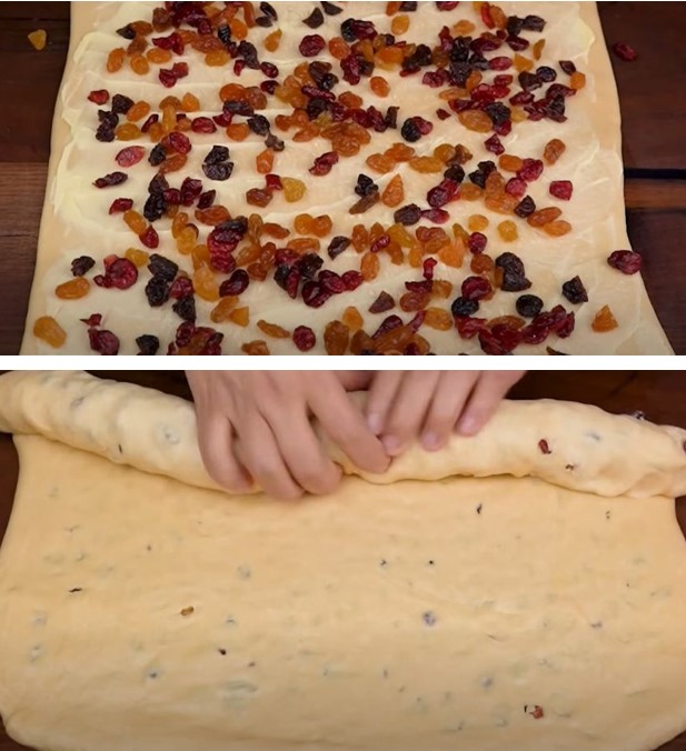 Una vez que la masa haya reposado, colócala sobre una superficie enharinada y extiéndela con un rodillo en forma de rectángulo fino y largo. Unta una capa fina de mantequilla sobre la masa y distribuye las frutas confitadas de manera uniforme.