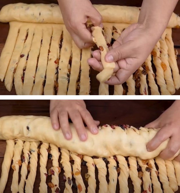 Enrolla la mitad de la masa y deja el otro extremo sin enrollar. Corta en tiras la mitad sin enrollar y luego enrolla estas tiras alrededor de la parte enrollada para formar una especie de rosquilla.