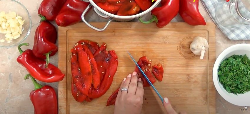 -Pela los pimientos: Una vez asados, introduce los pimientos en una bolsa de plástico y ciérrala herméticamente. Déjalos reposar unos 10 minutos para que el vapor ablande la piel. Luego, retira los pimientos de la bolsa y pela la piel con cuidado. Retira las semillas y corta los pimientos en tiras o trozos grandes.