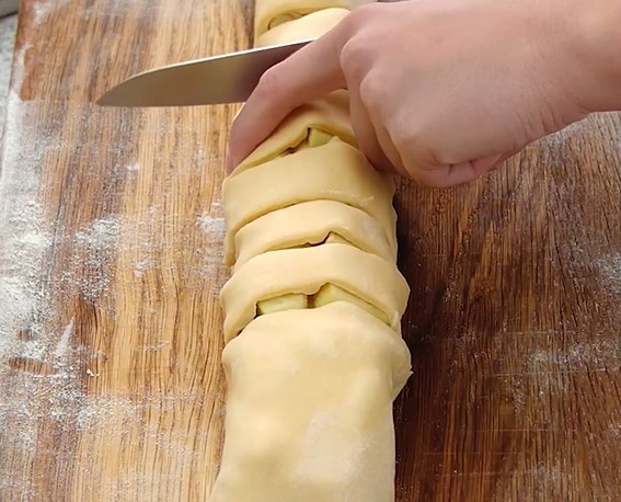 Se distribuyen los cubos de manzana sobre la masa y se espolvorea con azúcar de vainilla. Se enrolla la masa y se corta en rodajas de aproximadamente 3 cm de grosor.