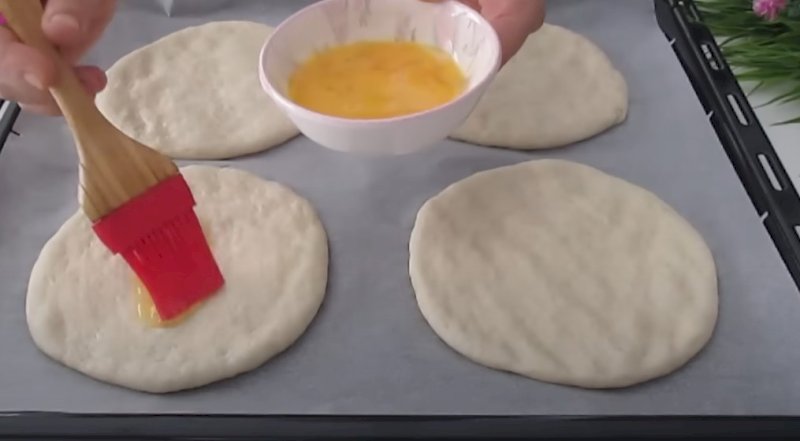 -Presiona cada bollo con la mano para aplanarlos ligeramente. Pincela cada disco resultante con el huevo batido.