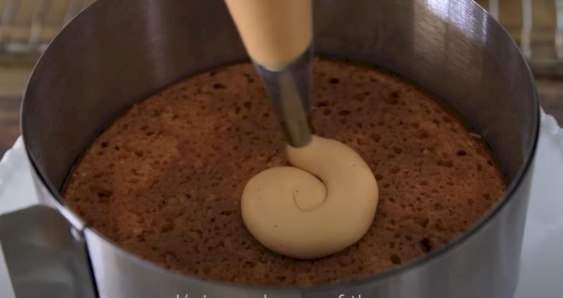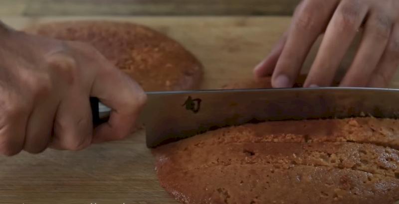 Repetir: colocar la segunda capa de bizcocho, remojar con almíbar, extender otra capa de nata, espolvorear avellanas. Coloque la tercera capa de pastel (con el lado cortado hacia abajo), remójela con almíbar. Extienda la crema restante sobre la parte superior y los lados del pastel.