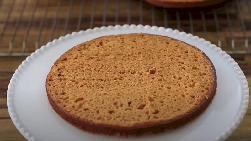 7. Montaje: coloque la primera capa de pastel (con el lado cortado hacia arriba) en el medio de la fuente, empape con el almíbar. Extienda una capa de crema, espolvoree 1-2 cucharadas de avellanas trituradas.