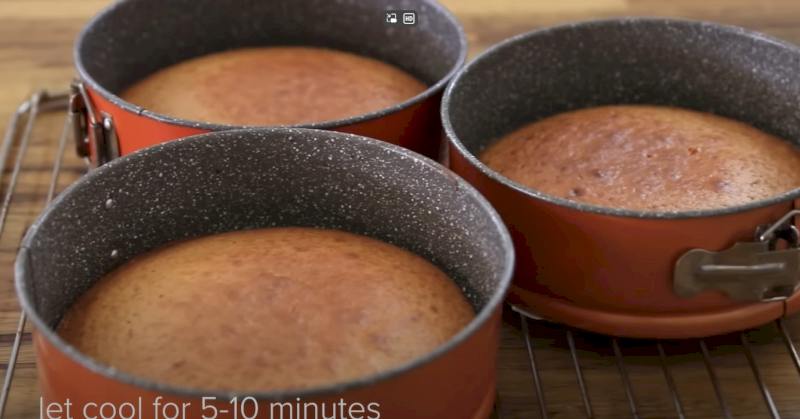 1. Prepara el pastel: Precaliente el horno a 350F (175C). Cubra tres moldes para pasteles redondos de 8 pulgadas con pergamino y engrase con mantequilla y espolvoree la harina. reservar.