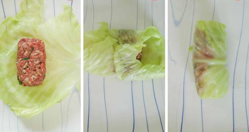 -Armar los rollos de repollo: Coloca algunas hojas de repollo en el fondo de una fuente para hornear profunda de 9″ x 13″ o en una bandeja para asar. Tomando una hoja a la vez, distribuye aproximadamente ¼ de taza de la mezcla de carne molida encima y enrolla, doblando los lados y enrollando, colocando en la fuente preparada con el lado de la costura hacia abajo. Continúa con la mezcla de carne molida restante y las hojas.