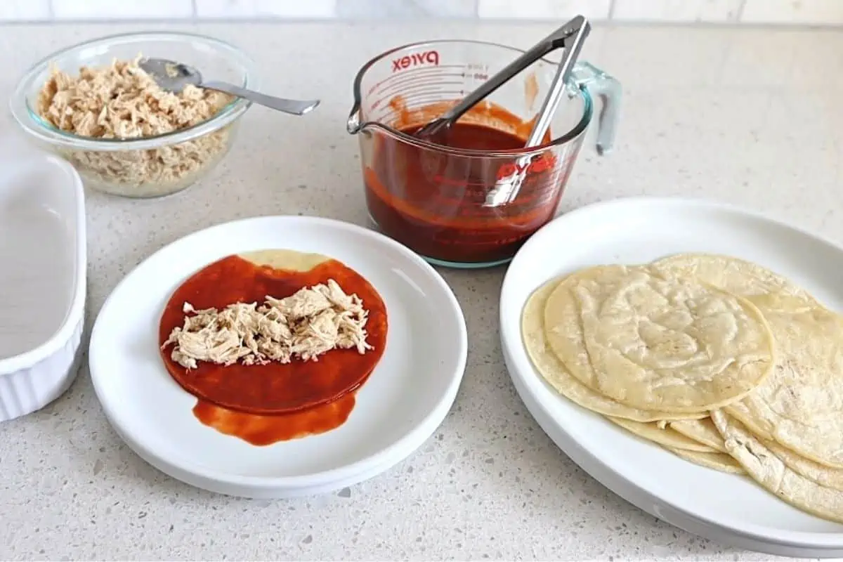 -Montaje de las Enchiladas: Calienta las tortillas de maíz en un comal o sartén. Pasa cada tortilla por la salsa roja, asegurándote de cubrirla completamente. Coloca una porción del relleno en el centro de cada tortilla y dóblala o enróllala.