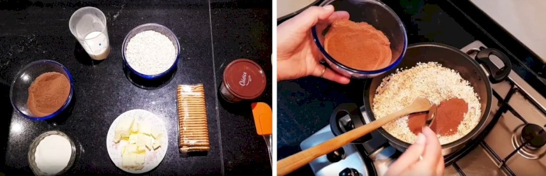Para empezar vamos a poner en una olla 125 ml. de leche junto con el cacao en polvo, la avena, el azúcar y el dulce de leche. Lo mandamos a un fuego mínimo/medio.