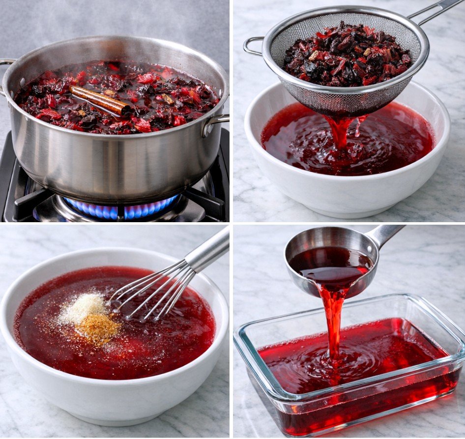🔷 Incorpora la grenetina hidratada a la infusión de jamaica cuando esté tibia (no hirviendo) y mezcla muy bien hasta que se disuelva completamente.