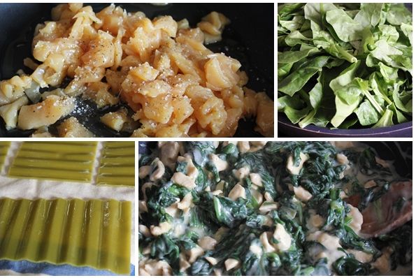 🍗 Extiende una capa de la mezcla de pollo y espinaca sobre las láminas.