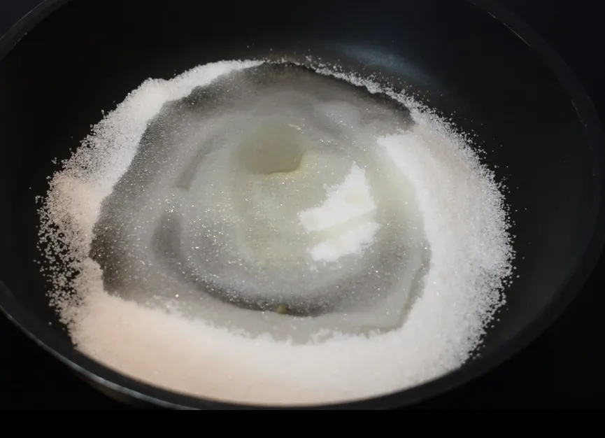-En un cazo a fuego medio colocamos el azúcar, el zumo de piña y el jugo de limón. Lo dejaremos sin remover unos 7 minutos o hasta que tenga un color dorado. Será importante ir vigilando para que no se queme, pues cogería un sabor amargo.