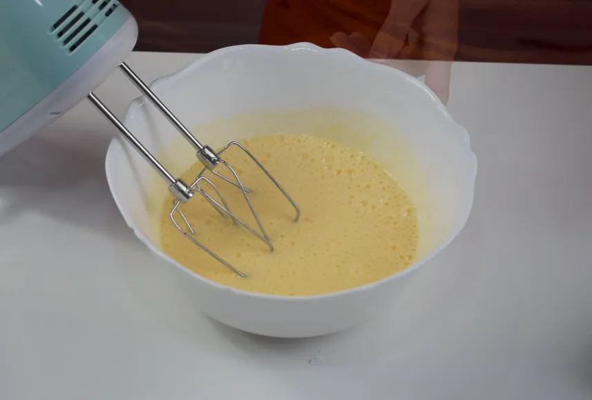 -Agregamos la harina y la levadura tamizadas y mezclamos con las varillas eléctricas hasta obtener una masa homogénea. Para que la harina no salga volando, mezclaremos primero un poco con las varillas apagadas e iremos subiendo la velocidad progresivamente.
