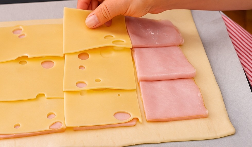 🧷 Paso 3: Cubre toda la superficie de la masa con lonchas de jamón cocido. Encima, coloca el queso que prefieras. Recuerda que el queso fundido es el alma de estos bocaditos. 💛