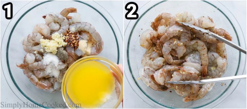 -En un tazón grande, mezcla los camarones con la mantequilla derretida, el ajo picado, la sal, la pimienta, la cebolla en polvo y las hojuelas de pimiento rojo triturado.