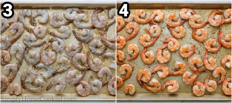 -Coloca los camarones sazonados en una bandeja para hornear con borde, en una sola capa.