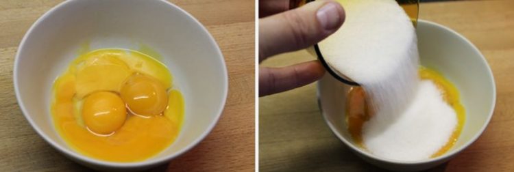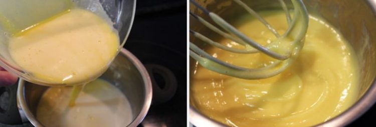 En un recipiente hondo mezclamos las yemas de huevo con el azúcar y la harina fina de maíz. Cuando la leche esté caliente retiramos la rama de canela y la piel de limón, vertemos la mitad sobre la mezcla anterior y removemos con unas varillas hasta incorporar. Devolvemos al cacito y llevamos de nuevo al fuego.