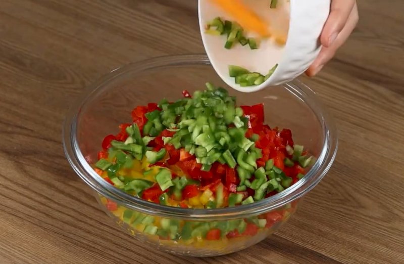 -Picamos un pimiento amarillo y un pimiento verde. Después de cortar todas las especias en trozos muy pequeños, la transferiremos a un bol.Añadimos cilantro, y lo mezclaremos muy bien.