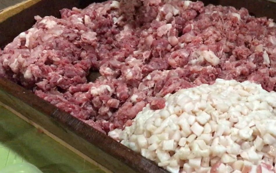 Comienza enfriando la carne de cerdo y la carne de vaca a -1°C. Luego, pica la carne de vaca en trozos de hasta 10 mm y la carne de cerdo en trozos de 12 mm.
