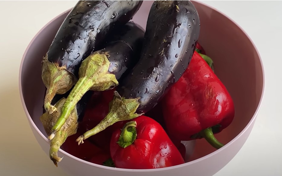-Limpia concienzudamente las berenjenas y los pimientos rojos. Disponlos en una bandeja para hornear y ásalos en el horno precalentado a 200°C, aproximadamente durante 30-40 minutos o hasta que la piel presente arrugas y se desprenda fácilmente.