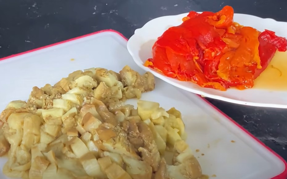 -Una vez retiradas las berenjenas y los pimientos del horno, permíteles enfriarse lo suficiente para manipularlos o, con la ayuda de un tenedor, elimina la piel. Acto seguido, córtalos en pequeños trozos.
