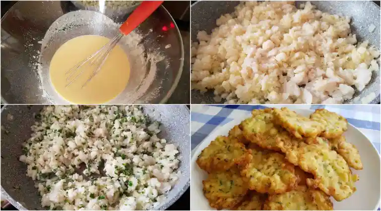 -Dejamos entibiar y añadimos el huevo. Removemos hasta que tenga consistencia de una crema. Añadimos el contenido de la sartén (el bacalao con la cebolla y el ajo y perejil) y mezclamos con la masa.